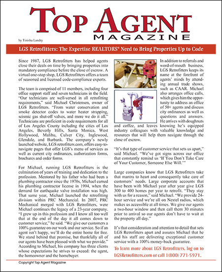 “Since 1987, LGS Retrofitters has helped agents close their deals on time by bringing properties into mandatory compliance before the close of escrow. A virtual one-stop shop, LGS Retrofitters offers a team of seasoned and licensed code-compliance experts.”